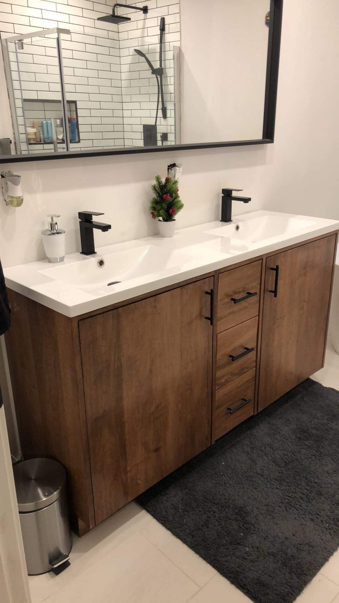 (La photo montre la vanité en merisier fini chêne vieillit SANS dessus)